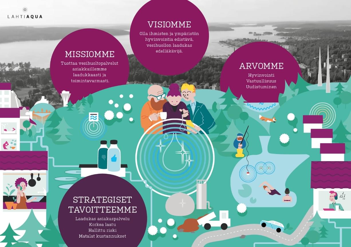 Perustehtävänämme on huolehtia, että vesihuolto alueellamme on korkealaatuista, turvallista ja kustannustehokasta. Haluamme olla vesihuollon laadukas edelläkävijä ja luomassa ihmisten ja ympäristön hyvinvointia. Olemmehan päivittäin läsnä asiakkaidemme arjessa.